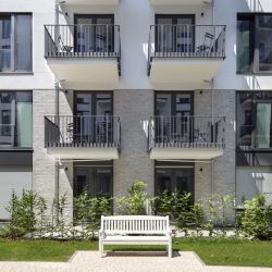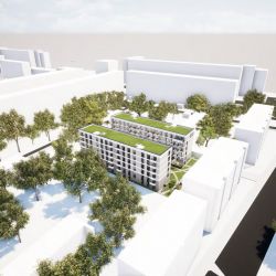 Bautyp: 2 Gebäude aus mehrgeschossigem Stahlbetonbau für Kita für 50 Kinder und 66 Wohneinheiten