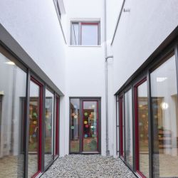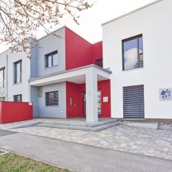 Das moderne Flachdachgebäude mit Dachbegrünung fügt sich gut in die umliegende, zum Teil sehr neue, Bebauung ein und bietet den jungen Familien einen kurzen Weg um Ihre Kinder in die Krippe oder den Kindergarten zu bringen.