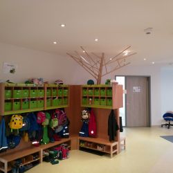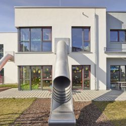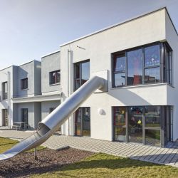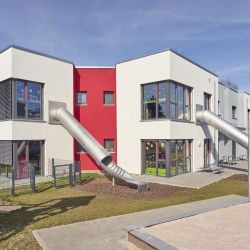 Als zweiter Rettungsweg wurden, aus dem Obergeschoss, Rutschen in den einzelnen Gruppenräumen geplant, die auch die Funktion eines Spielgerätes für die Kinder mit übernehmen.