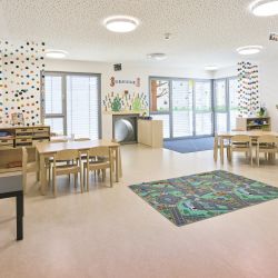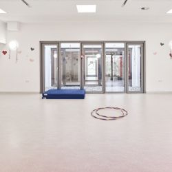 Der Grundriss ist so angeordnet, dass ein großzügiger Spielflur um ein lichtdurchflutetes Atrium entsteht, in dem die Kinder viel Raum zum Spielen, Fahren und Begegnen mit den anderen Gruppen der Einrichtung haben.