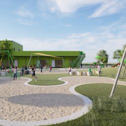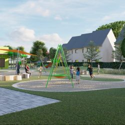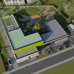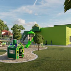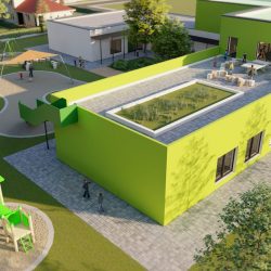 Neubau einer zweigeschossigen Kindertagesstätte mit zwei Krippengruppen mit je 12 Kindern, zwei Kindergartengruppen mit je bis zu 30 Kindern, sowie einer Kinderhortgruppe für 25 Kinder.